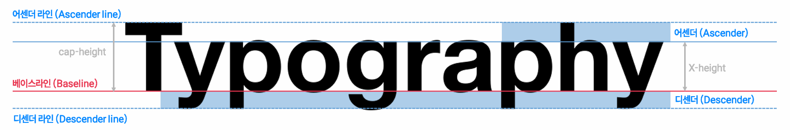 디센더(Descender): 베이스라인을 넘어서 아래로 내려온 부분