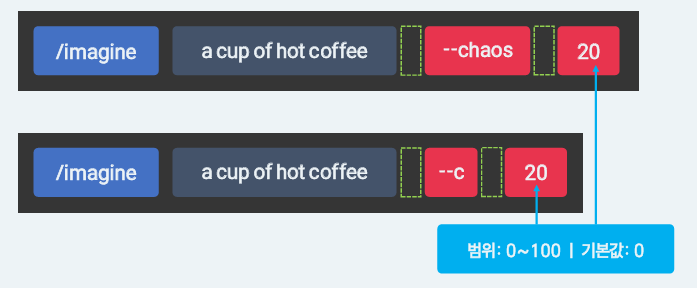 --chaos: 무작위성을 조절하는 파라미터.  (무작위성: 예상하지 못한 결과와 구성을 생성하는 정도)