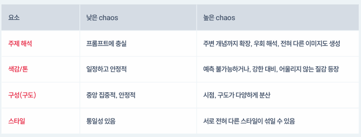 반면, chaos 숫자가 낮을수록 프롬프트에 무조건 충실하고, 통일성 있는 이미지를 준다.