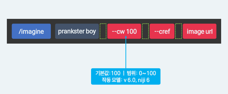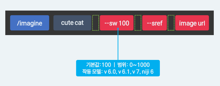 --sw(style weight): 스타일의 참조, 강도를 조절하는 기능을 갖는 파라미터. 참조하는 스타일이 결과물에 적용되는 정도를 조절한다.