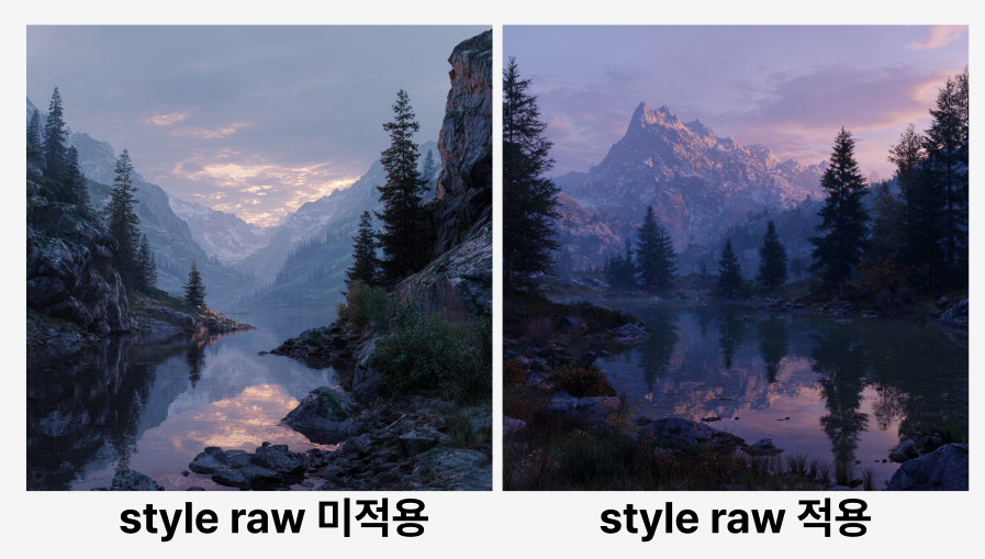 즉, 감성보다 프롬프트를 우선하는 파라미터다. style raw가 적용되면 조금 더 현실적인 이미지가 생성된다.