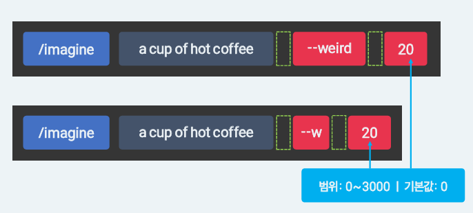 --weird: 기괴함 또 비정형성의 정도를 조절하는 파라미터로, 미드저니의 파라미터 중 가장 실험적인 파라미터가 된다.