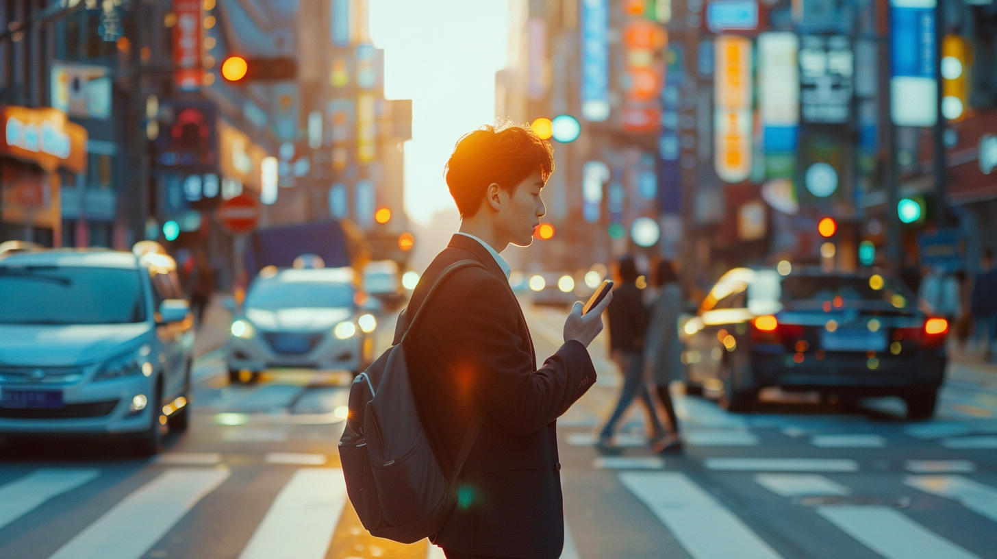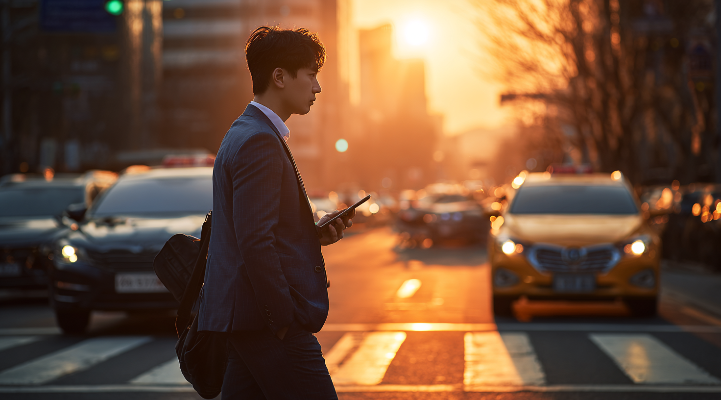 장면: a young korean man in business attire, holding his phone and walking on the crosswalk of an urban street at sunset