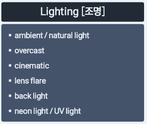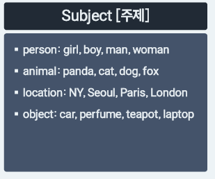 주제(subject): 이미지 생성의 대상으로, 명사의 중심으로 작성된다.