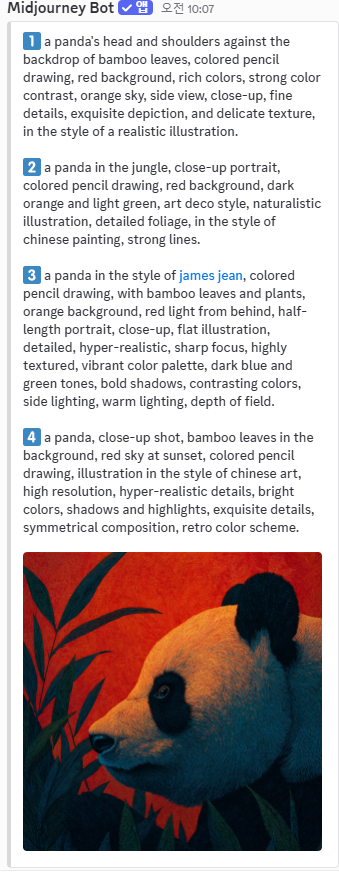 3) 미드저니 봇의 프롬프트 제안 확인하기(4가지 제공)