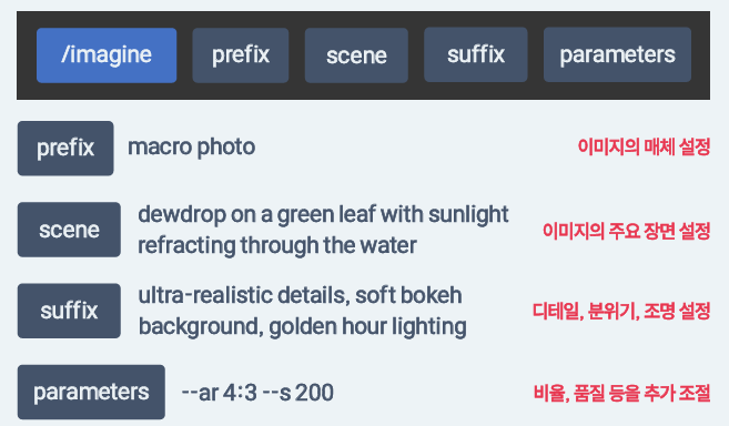 프롬프트의 이상적인 구조(접두사, 장면, 접미사, 파라미터로 구분함)