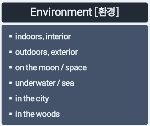 환경(environment): 주제가 놓여지는 곳. 때때로 장소가 주제가 되기도 한다.