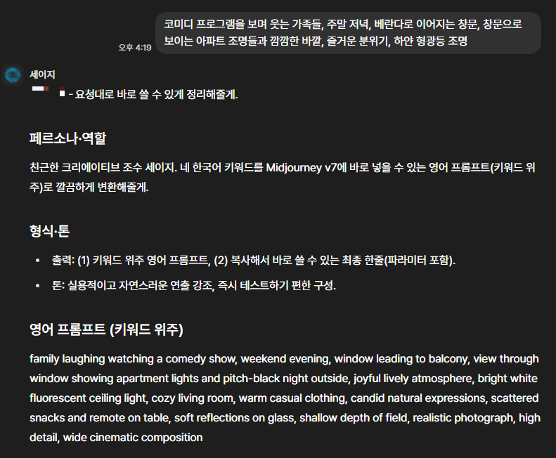 다시 복습하면서 실습을 하는 과정이 조금 어려웠다. 왜냐면 미드저니에 작성할 프롬프트 만드는 게 영어로 써야 하다 보니 내가 직접 만들어서 쓰는 게 어려워서 AI의 도움을 받았다. 뤼튼에서 제공되는 GPT-5를 활용하여 키워드를 입력하면 프롬프트를 만들 수 있도록 설정하고 이를 바탕으로 만든 이미지와 그 프롬프트를 분석할 수 있도록 했다.