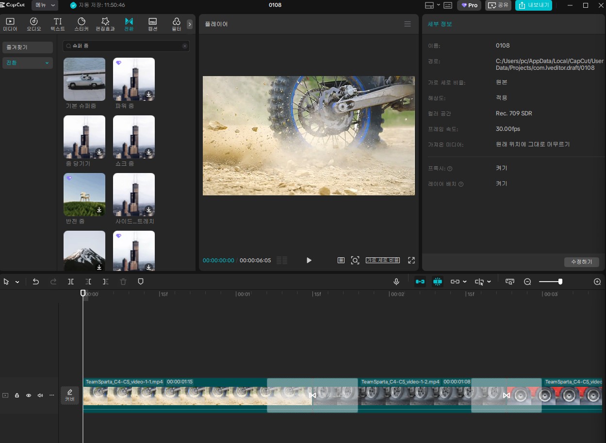 이번 영상 제작에는 영상 전환시점에 전환 효과를 넣는 것을 주로 실습했다.