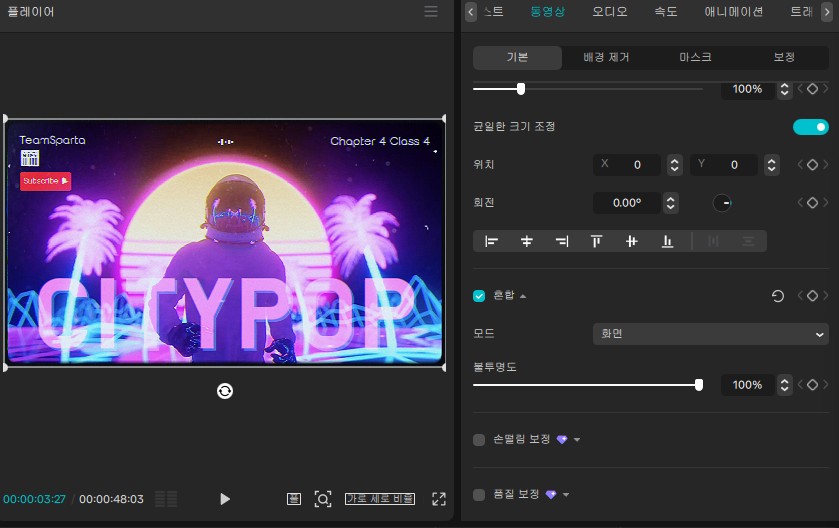 또한, 영상에 블렌딩 모드를 적용하면 포토샵처럼 다른 무드를 연출하는 것이 가능하다.